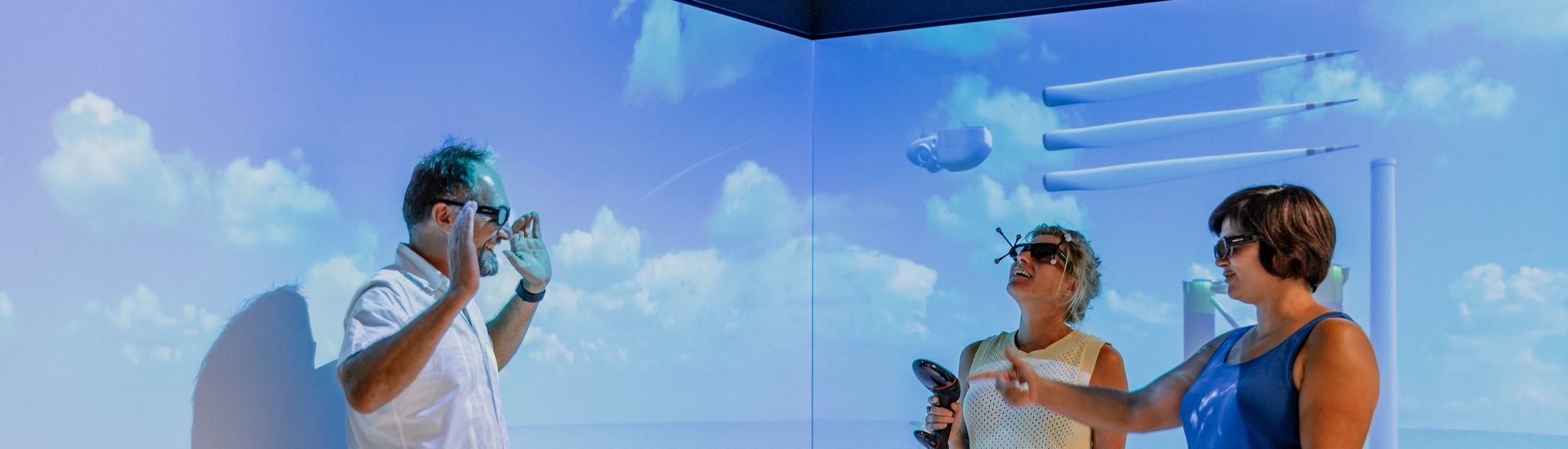 Part of the training laboratory is the VR-CAVE, a state-of-the-art projection room set up by IMSYS, in which the virtual scenarios can be explored. With projections on three walls (with a side image area of 360/225 x 225 cm and a floor area of 8m2) and an ART Tracking system (TRACKPACK/E cameras) with head tracking, participants can fully immerse themselves in an immersive digital environment in which they can move freely and interact with the virtual content. This collective learning experience is particularly suitable for understanding complex offshore scenarios and team training.